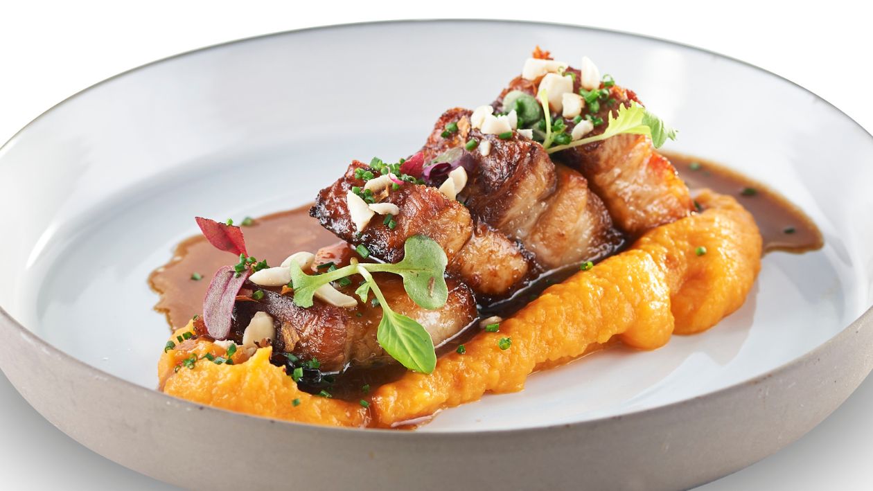 Бекон на sous vide с пюре от сладък картов и демиглас сос