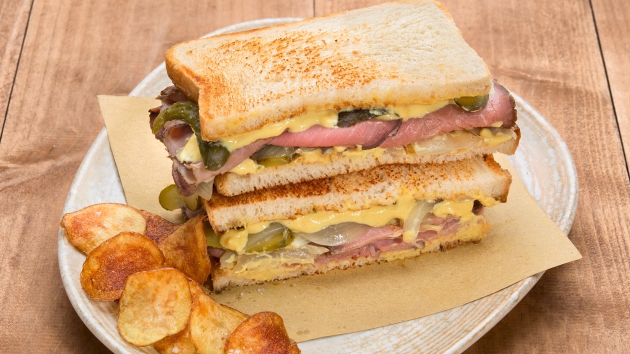 • Запечете хляба и намажете едната филия с майонеза а другата с горчица